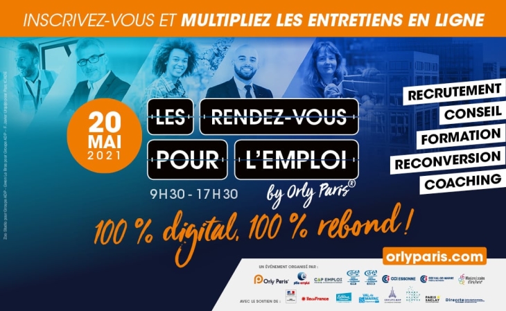 Les rendez-vous pour l'emploi d'Orly Paris reviennent pour une 7e édition 100% digitale qui se déroulera de 9h30 à 17h30 le jeudi 20 mai sur le site orlyparis.com.